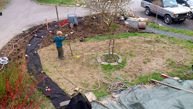 Kolla slänten där borta. Jag planterade en massa daggkåpor, nävor, iris, fingerborgsblommor, purpurklätt och annat i höstas. Tanken att det ska vara blommigt på sommaren. Hoppas det tar sig! Forsythian blommar i bakgrunden.